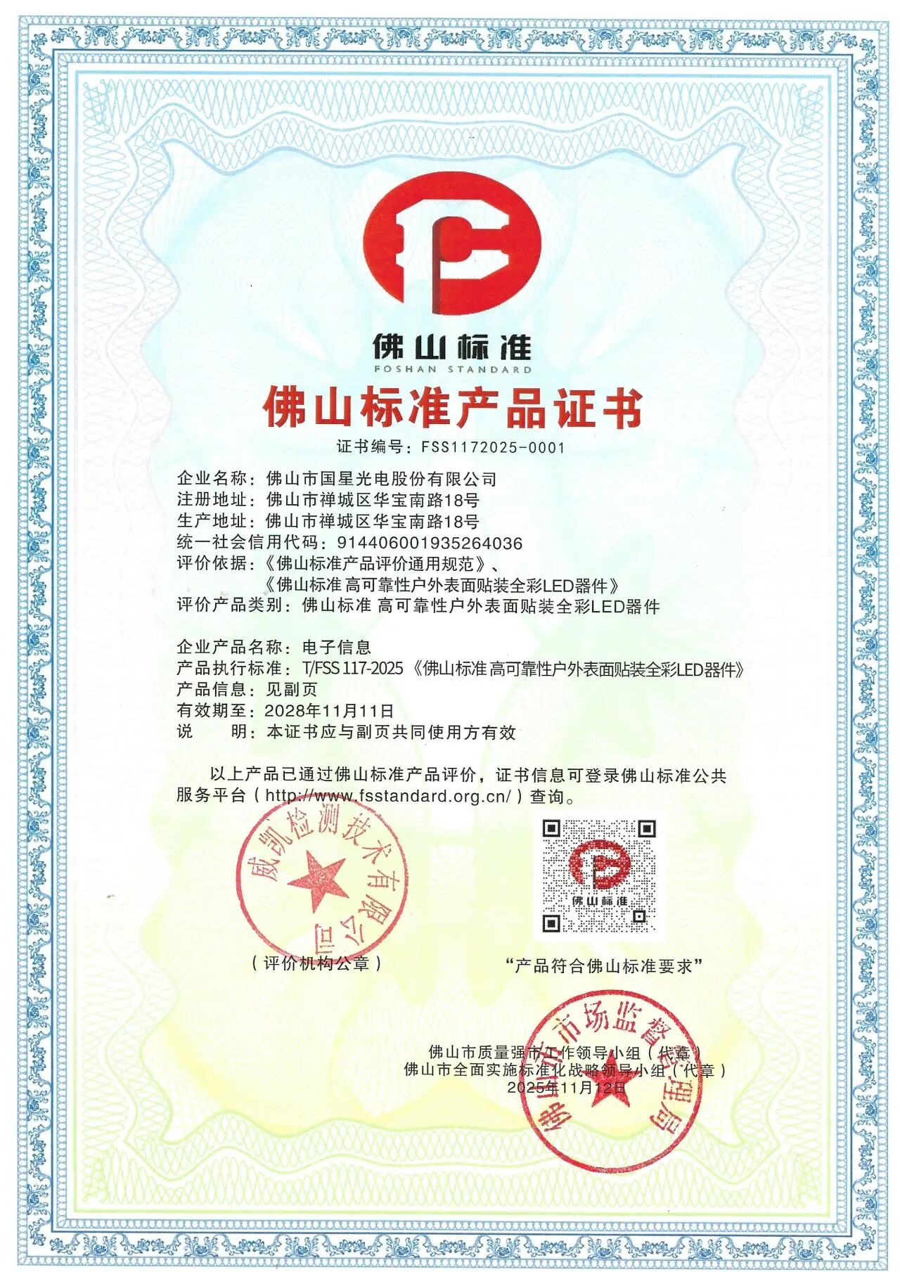 近日,佛山市市场监督管理局发布2025年佛山标准产品评价结果,国星光电申报的“高可靠性户外表面贴装全彩LED器件”成功上榜,获评“佛山标准产品”。