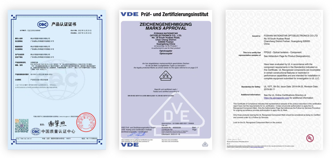 国星光电光电子器件事业部817光耦新品已通过CQC认证、VDE认证、UL认证,产品质量值得信赖。